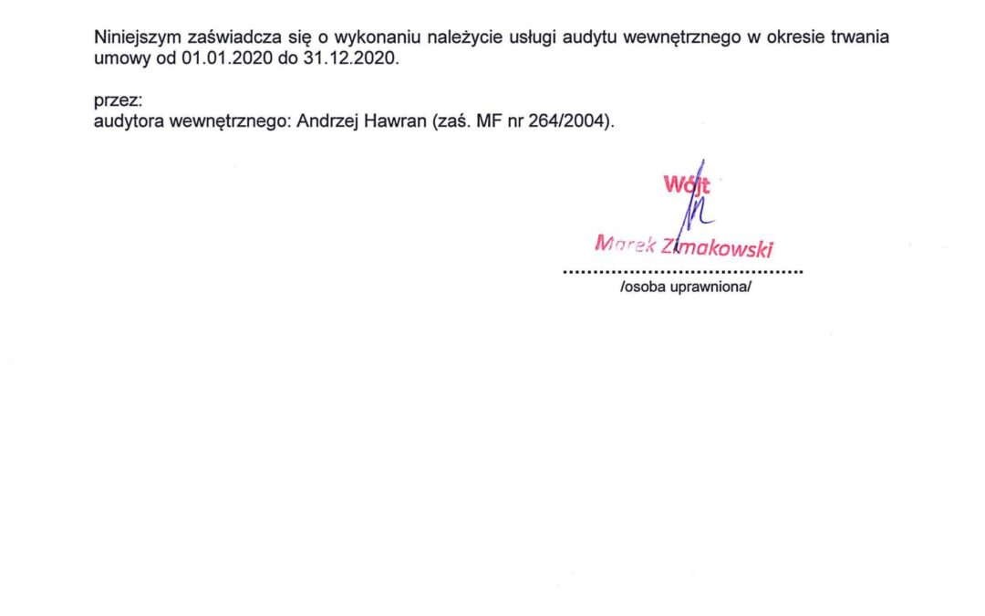 Zaświadczenia o należycie wykonanej umowie świadczenia usługi audytu wewnętrznego