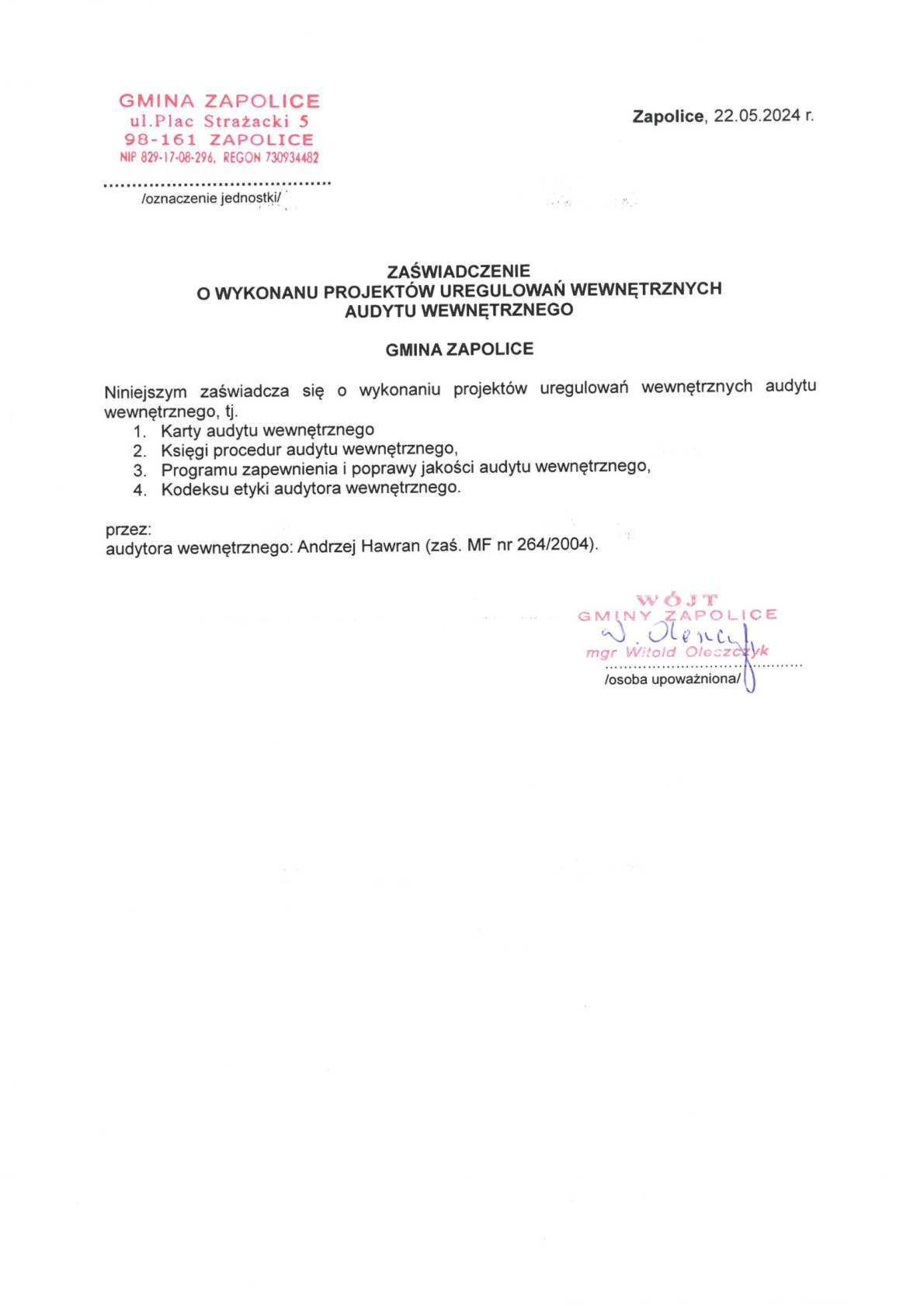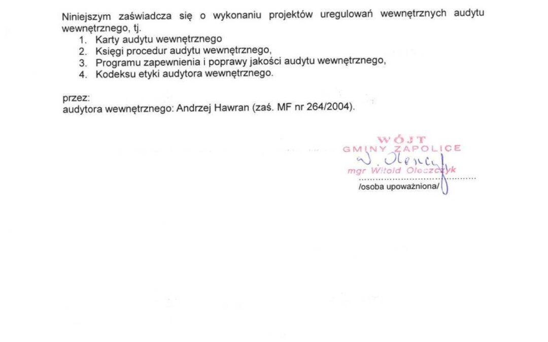 Zaświadczenia o sporządzonych projektach uregulowań wewnętrznych audytu wewnętrznego