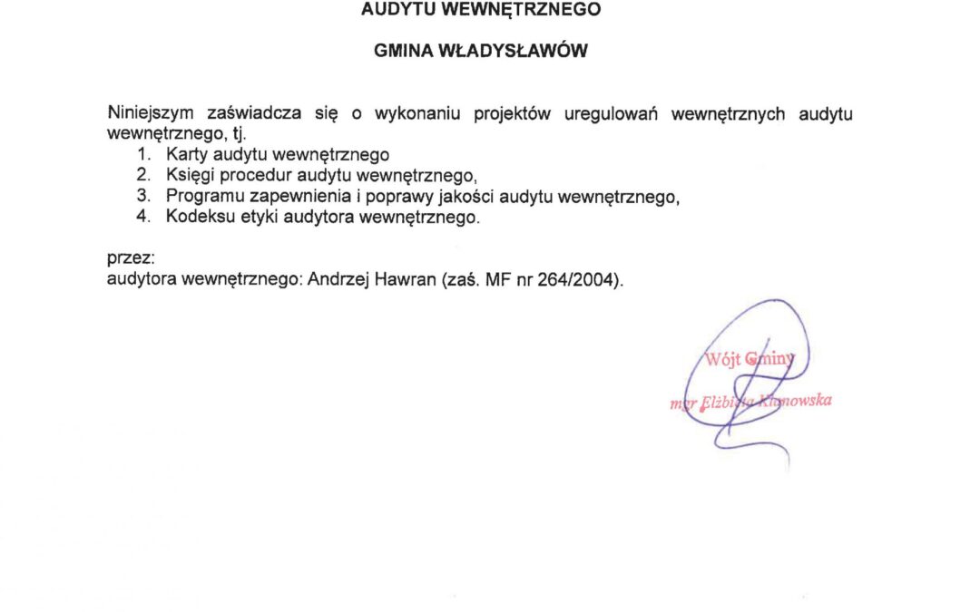 Zaświadczenia o sporządzonych projektach uregulowań wewnętrznych audytu wewnętrznego