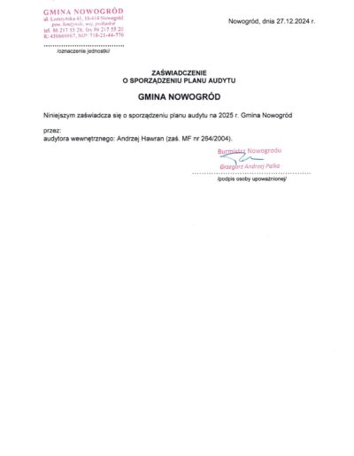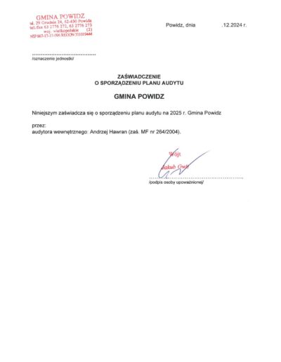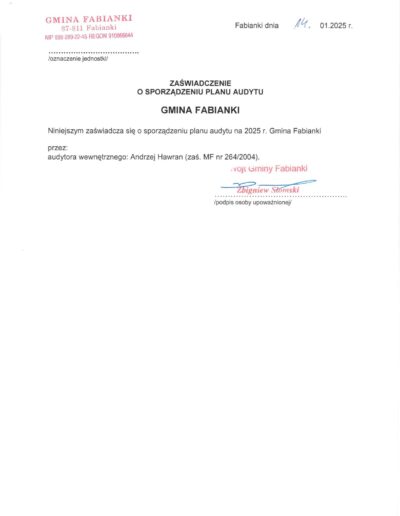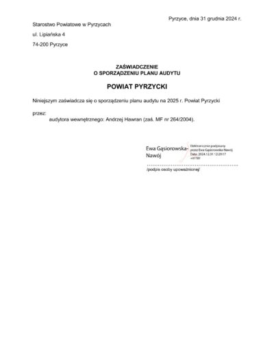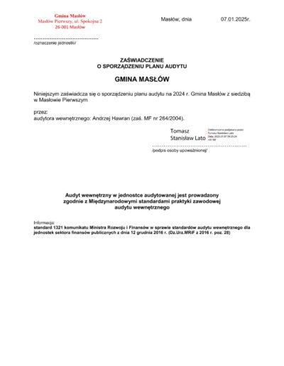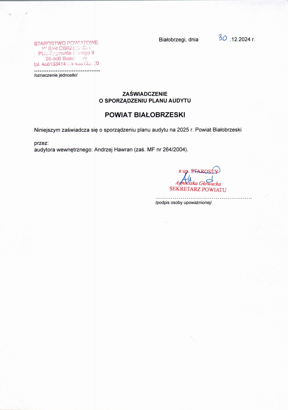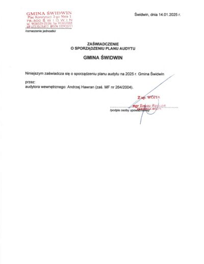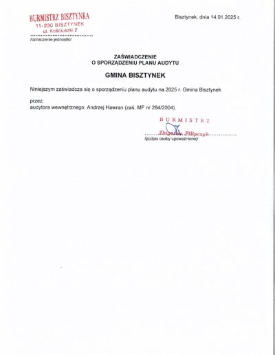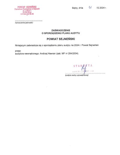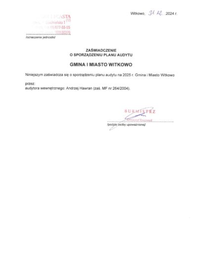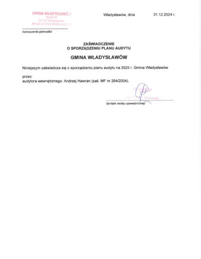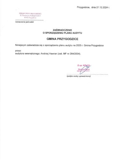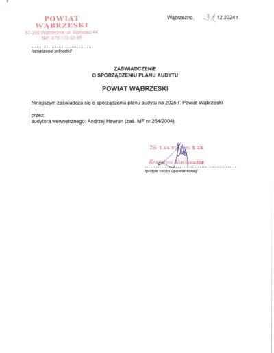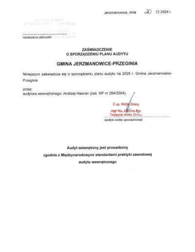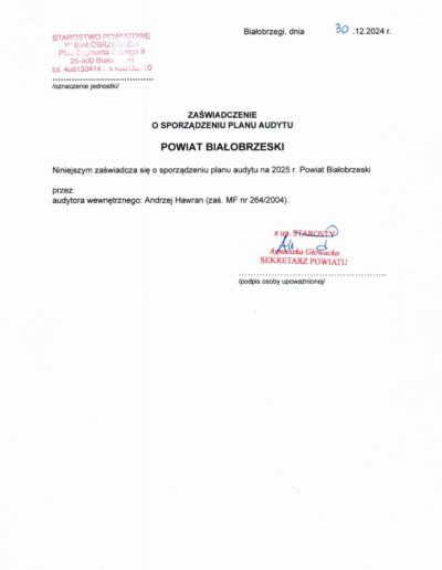 Zaświadczenia o sporządzeniu planu audytu wewnętrznego