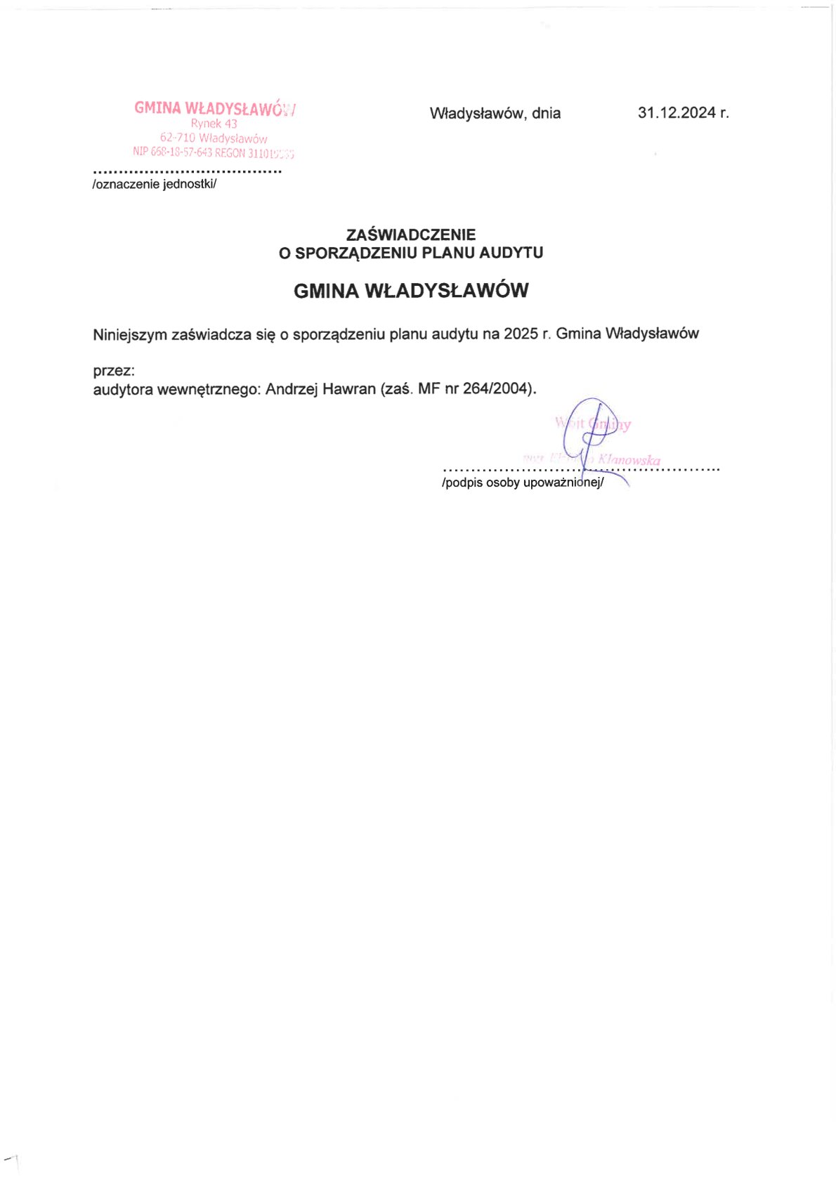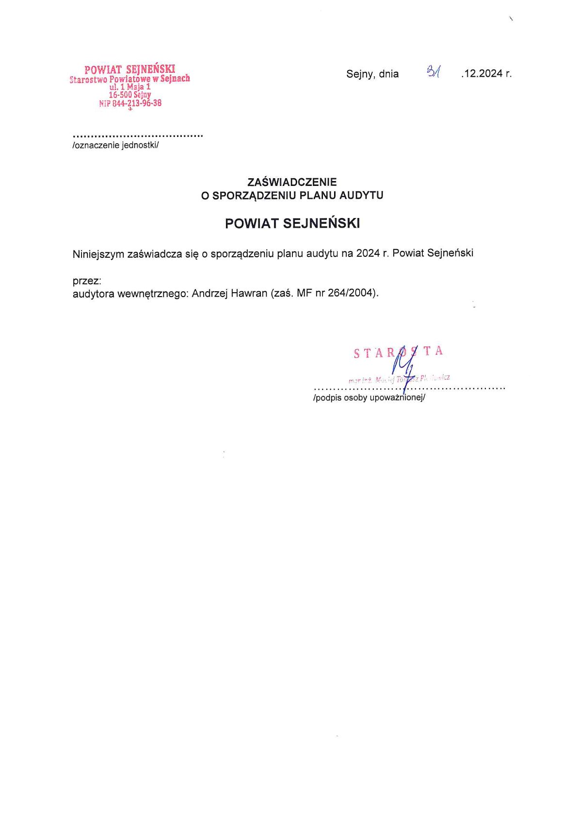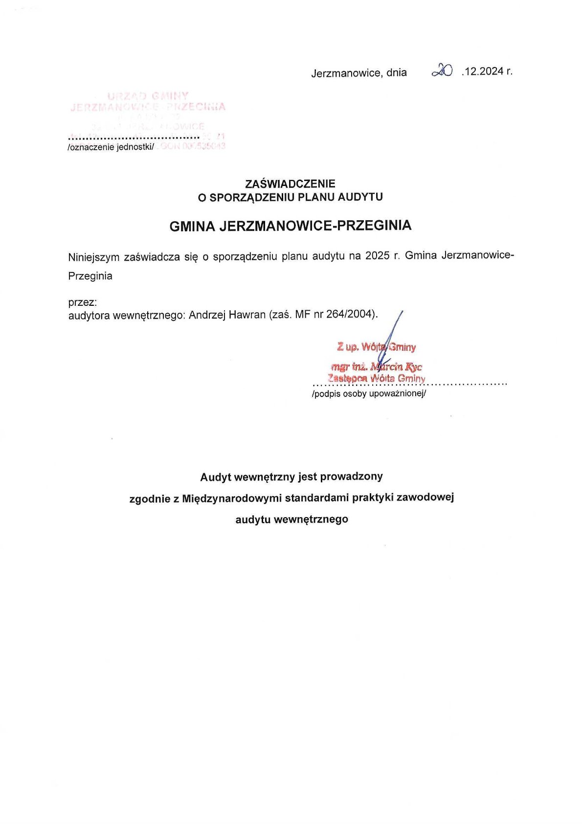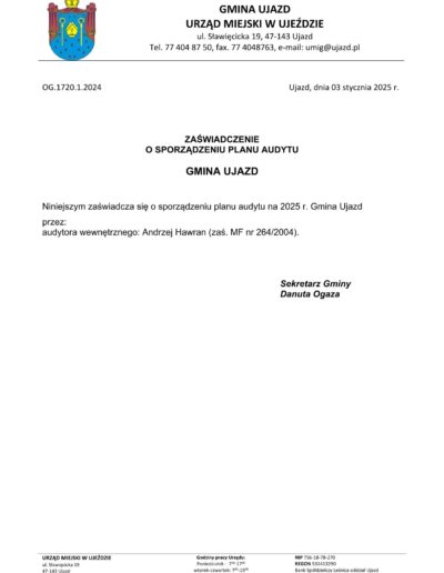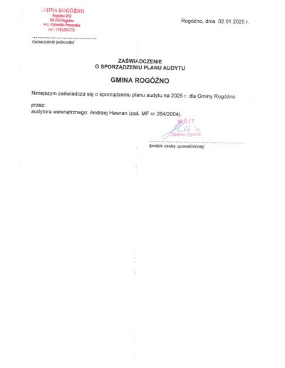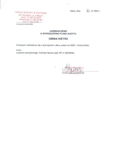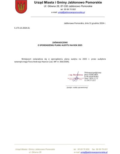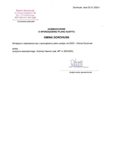 Zaświadczenia o sporządzeniu planu audytu wewnętrznego