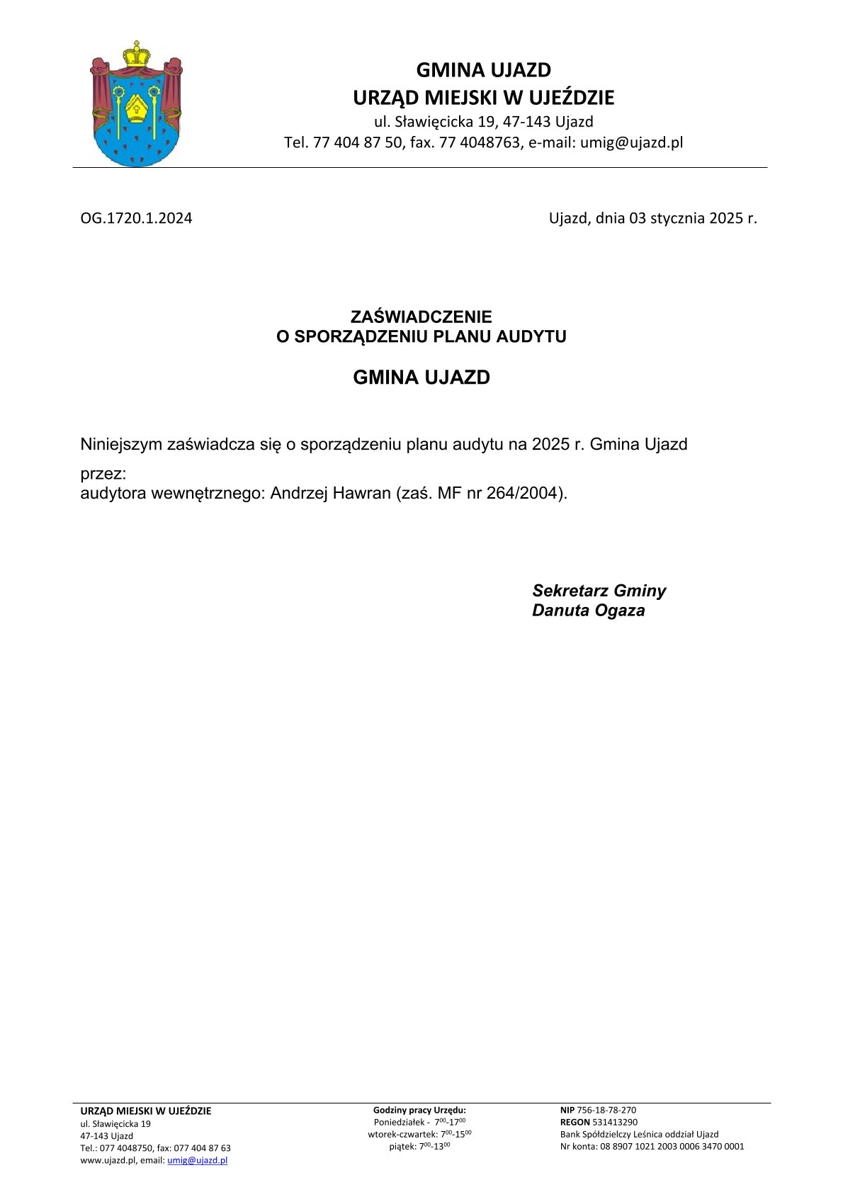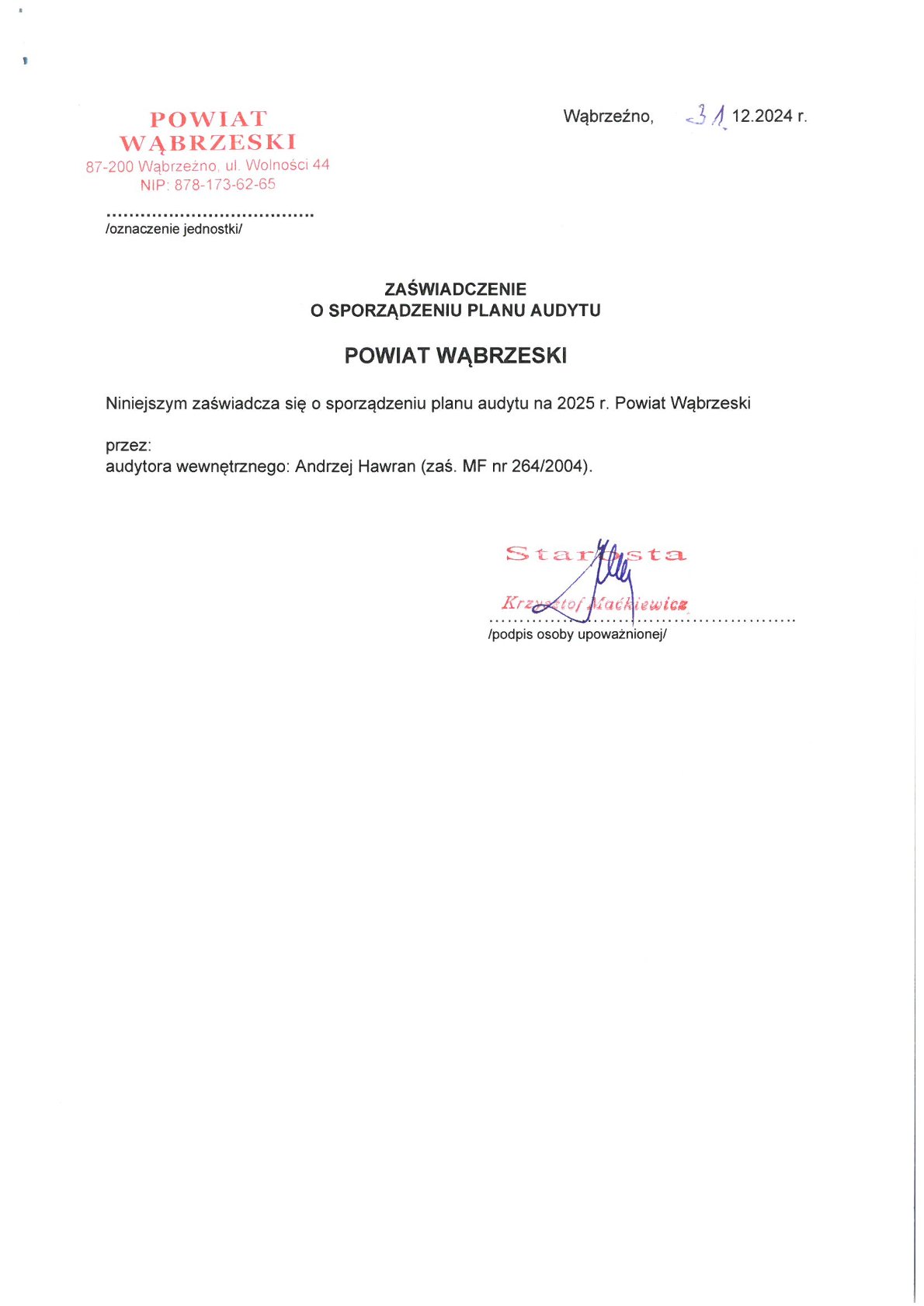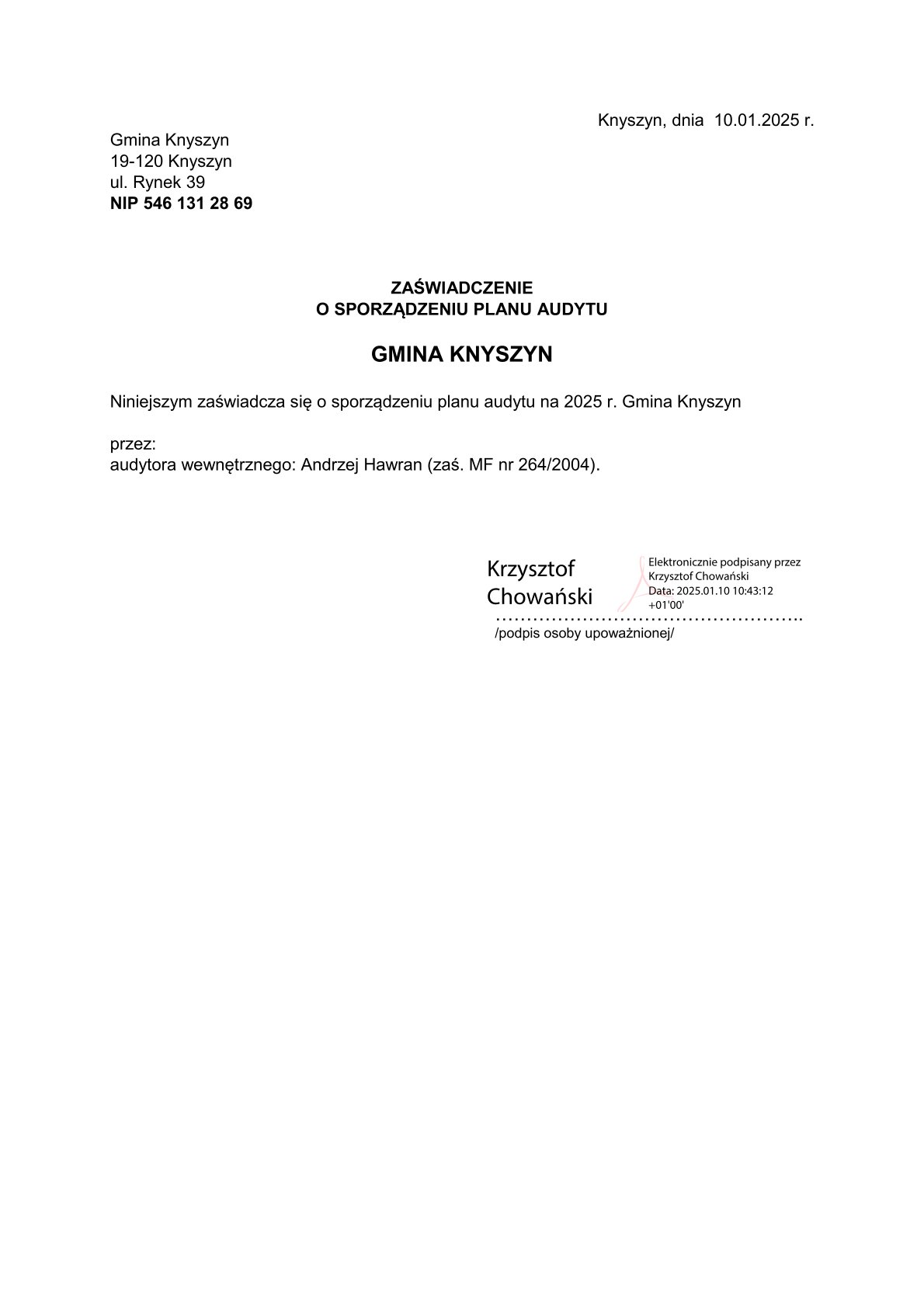 Zaświadczenia o sporządzeniu planu audytu wewnętrznego